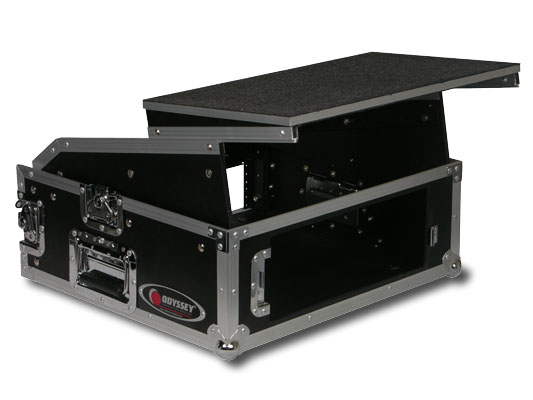 Our FRGS802 features a sliding laptop platform mounted on a traditional case. At your gig, set your laptop on the carpeted platform shelf surface, plug in and you're ready to go. Slide it forward to use your laptop. Slide it back to use the mixer section underneath.