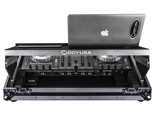 Configured with Angled Panels attached. Denon MC7000, Tracktor Maschine Studio, and tablet not inlcuded with case. Removable case lid not shown.