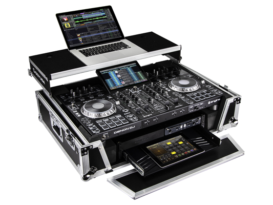 Shown with the optional GSA angled glide panel supports (sold separately). *Removable case lid not shown. **Denon Prime 4, MacBook, Akai Fire Grid controller, iPad, pullout rack shelf, and wireles mic system are not included with case.